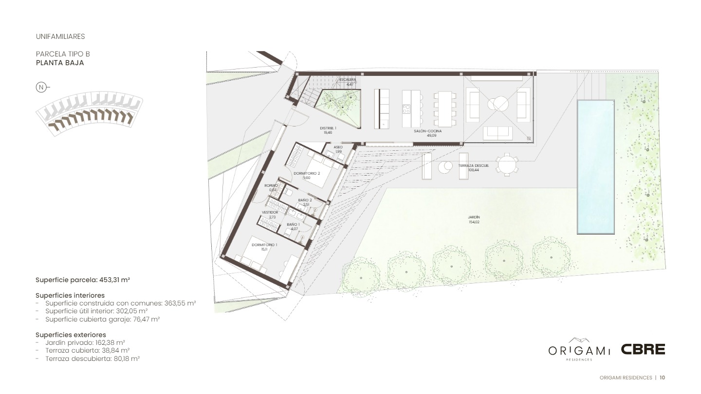 Donde singularidad y serenidad se pliegan en un mismo espacio. Origami Residences, un proyecto arquitectónico único que se ha concebido como un icono constructivo y de carácter, manteniendo en todo momento un estilo atemporal y cuidando todos los detalles en cuanto a diseño y calidades. Situado estratégicamente en Fresno Norte, el acceso a Origami Residences, se realizara a través del Kilómetro 23 de la A-1, lo que facilita una conexión inmejorable con la ciudad de Madrid. Fresno Norte es una de las zonas residenciales más atractivas de la capital por sus excelentes comunicaciones, zonas verdes, una amplia oferta de ocio, centros comerciales, prestigiosos colegios internacionales, hospitales, recintos deportivos y a escasos minutos del aeropuerto Adolfo Suárez Madrid Barajas. El residencial se encuentra a pocos minutos de la Real Sociedad Hípica Española, el Circuito de Jarama y los reconocidos campos de golf La Moraleja y Golf RACE, proporcionando a la zona exclusividad y distinción. Además, la proximidad a reconocidos colegios garantiza opciones educativas de alto nivel. El proyecto consta de 24 viviendas unifamiliares de 5 dormitorios, con piscina y jardines privados, Viviendas que se caracterizan por la amplitud de sus espacios y su gran luminosidad, con zonas de estar diáfanas y abiertas a zonas exteriores que se unen directamente con espectaculares áreas ajardinadas. Todas ellas contarán con certificación BREEAM.